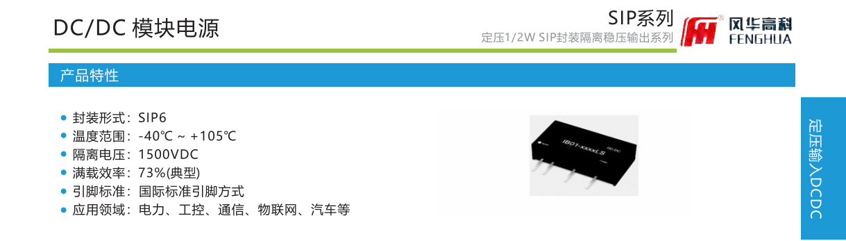 產品特性:封裝形式:SIP6溫度范圍:-40℃~+105°C隔離電壓:1500VDC滿載效率:73%(典型)引腳標準:國際標準引腳方式應用領域:電力、工控、通信、物聯網、汽車等