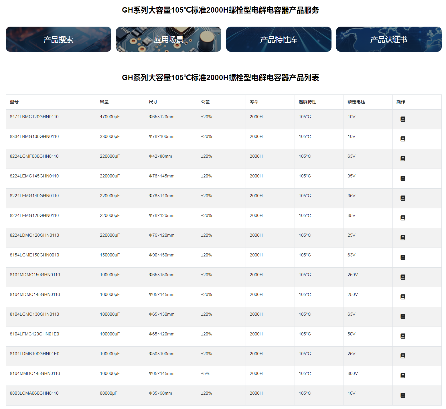GH系列大容量105℃標準2000H螺栓型電解電容器GH型特性:壽命: 105℃ 2000小時;寬溫度范圍;符合RoHS;◆應用適用于UPS不間斷電源、空調逆變壓器等電子設備。