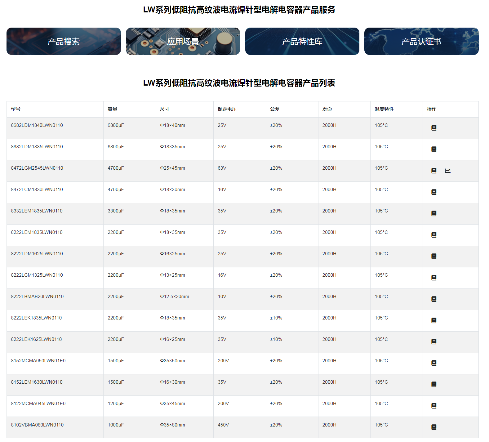 ■ LW系列低阻抗高紋波電流焊針型電解電容器◆特性:壽命: 105℃ 2000小時;適用于-40℃ 超低環境、大紋波電流;符合RoHS;◆應用:適用于充電樁、飼服器、通信設備及其它各種電子產品。