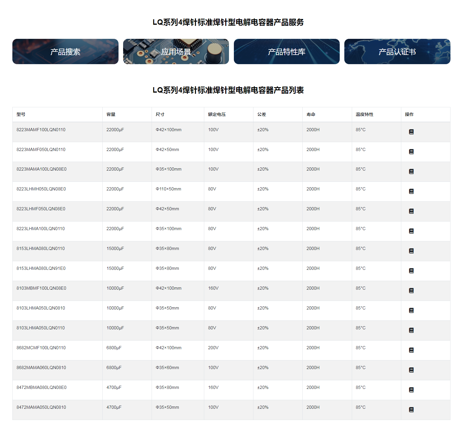 ■LQ系列4焊針標準焊針型電解電容器◆LQ型特征* 壽命: 85℃ 2000小時;* 小型化;* 符合 RoHS◆應用:* 適用于開關電源 、通信設備及其它各種電子產品。