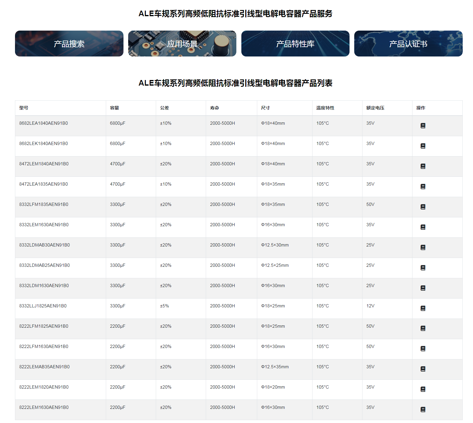 ■ALE車規(guī)系列高頻低阻抗標(biāo)準(zhǔn)引線型電解電容器◆特征* 壽命: 105℃ 2000~5000 小時* 低阻抗特性* 符合 AEC-Q200* 符合 RoHS◆應(yīng)用:* 適用于汽車模塊電子產(chǎn)品