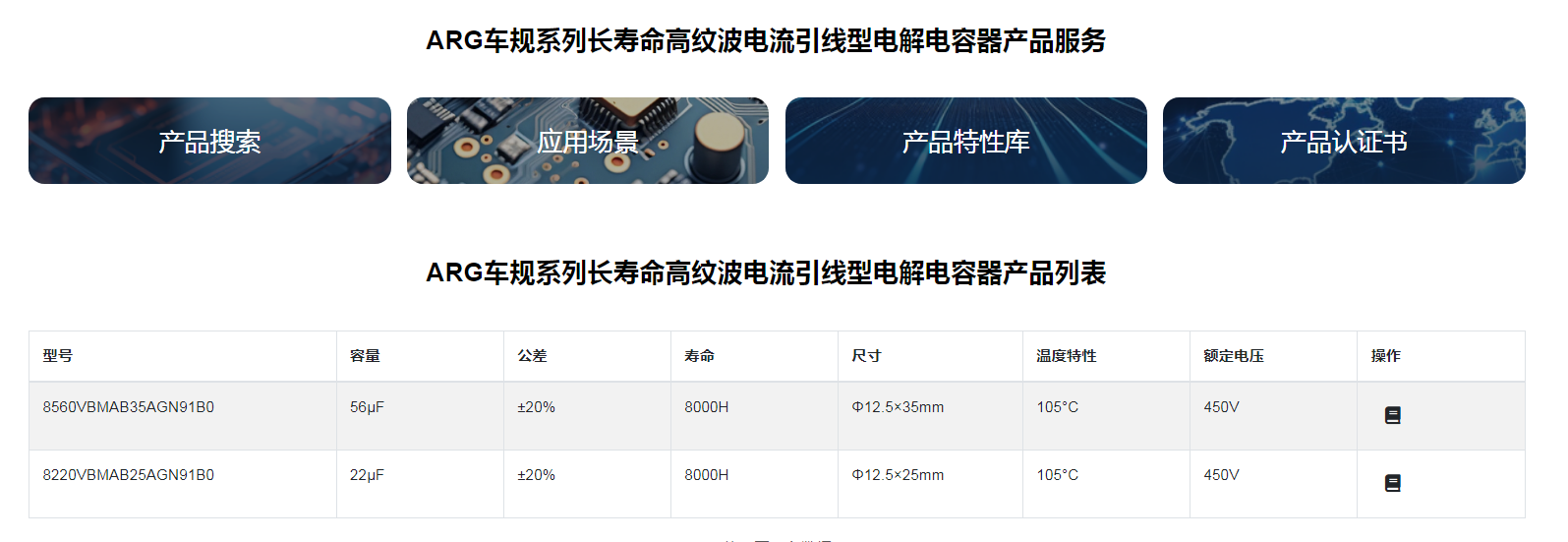 ■ARG車規系列長壽命高紋波電流引線型電解電容器◆特征* 壽命: 105℃ 8000 小時* 特長壽命* 符合 AEC-Q200* 符合 RoHS◆應用:* 適用于汽車模塊電子產品 、開關電源及其它各種電子電子產品