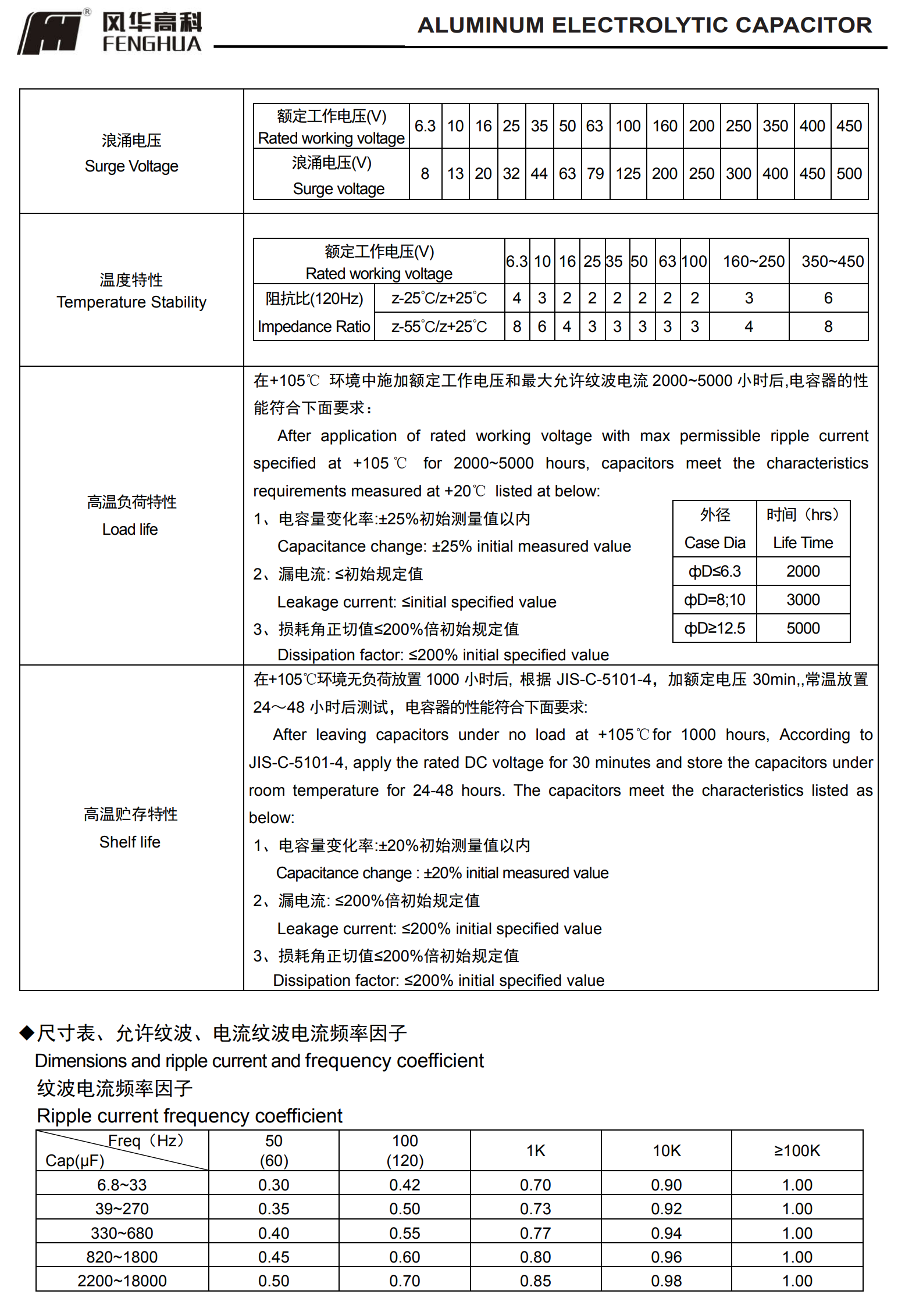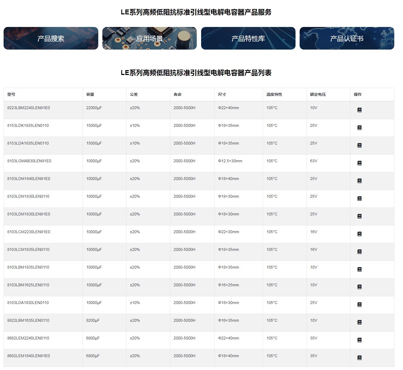 ■LE系列高頻低阻抗標準引線型電解電容器◆特征* 壽命: 105℃ 2000~5000 小時* 低阻抗* 符合 RoHS◆應用:* 適用于各類照明電源、通信設備 、開關電源等電子產品