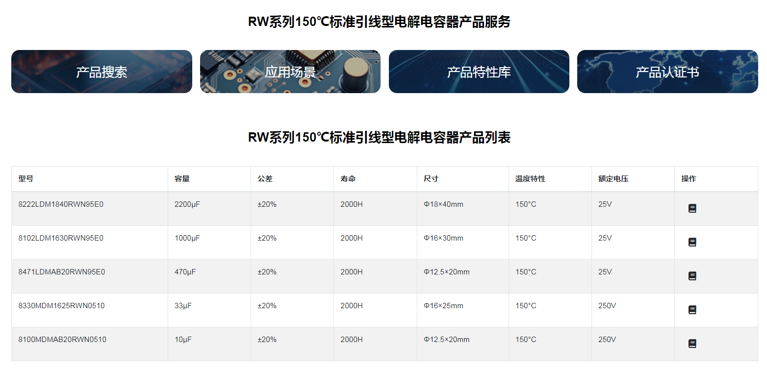 ■RW系列150℃標準引線型電解電容器◆特征* 壽命: 150℃ 2000 小時* 耐高溫* 符合 RoHS◆應用:*適用于汽車電子 、各類開關電源、LED 照明產品 、 LED 驅動器等電子產品