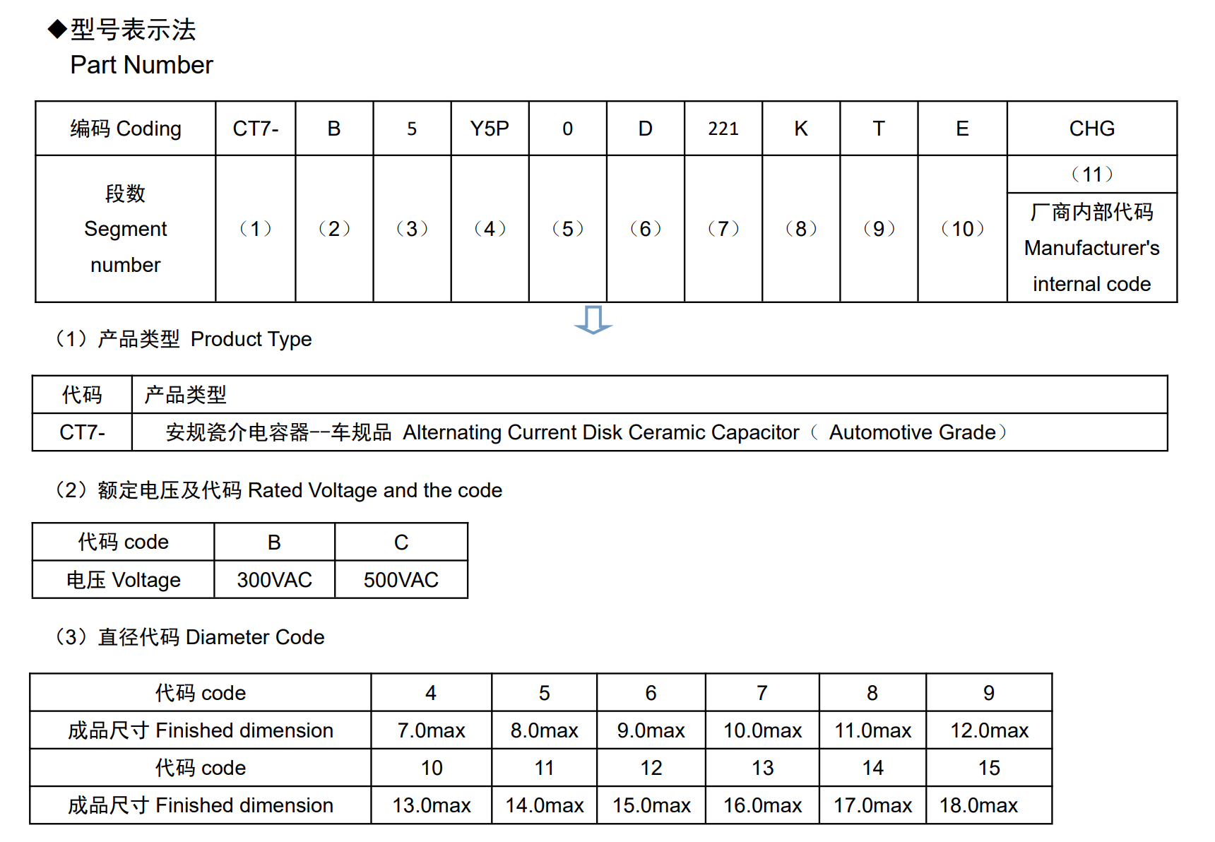 ■CT7 系列安規瓷介電容器--車規品◆特征* 符合 GB/T 6346.14-2015/IEC 60384.14-2005 及 AEC-Q200 REV D 認證標準。* 優異的耐振動性能,滿足標準 MIL-STD-202 Method 204、AEC-Q200。* 優異的快速溫變性能,滿足 JESD22 Method JA-104、AEC-Q200。◆應用* 適于在電子設備中作為跨電源線連接、天線耦合、旁路、濾波等。