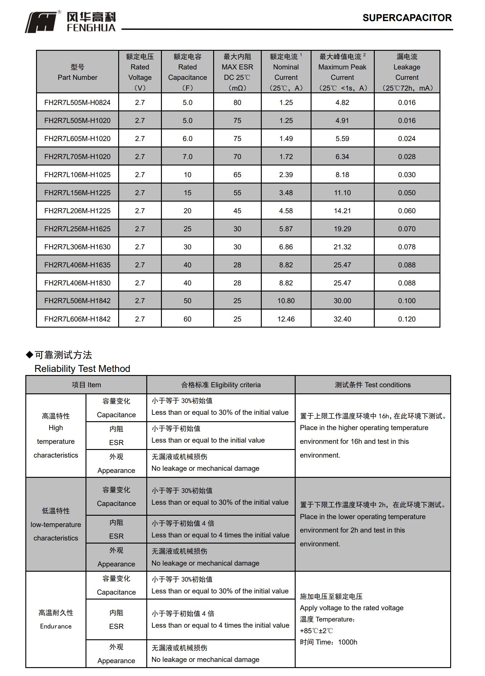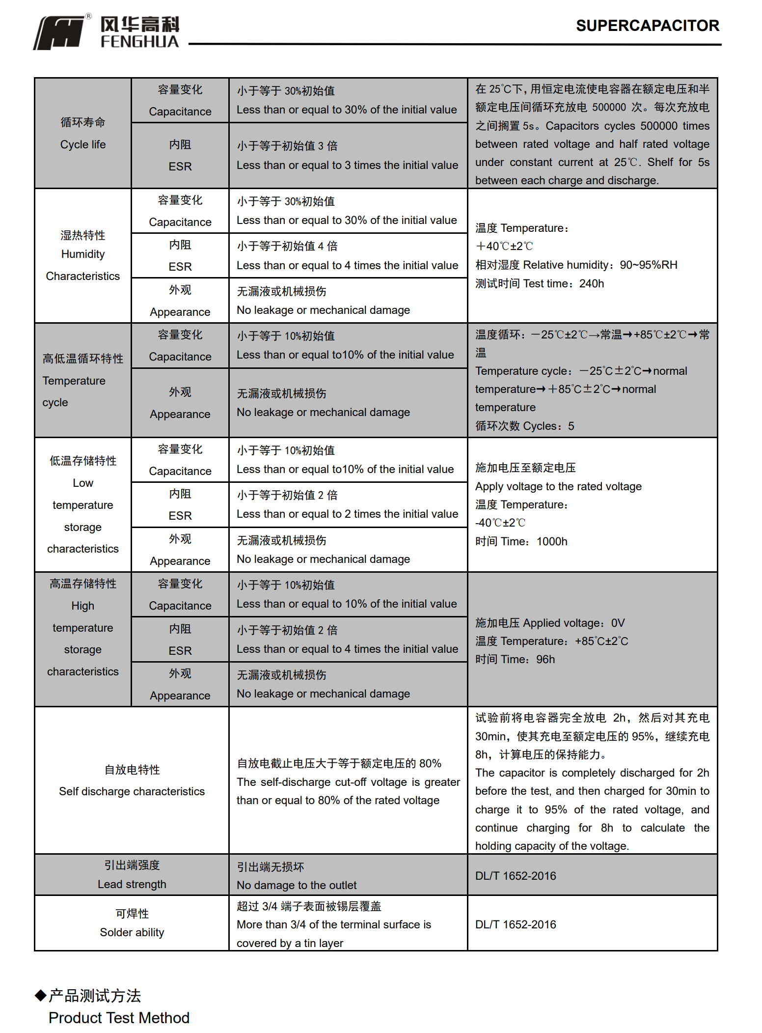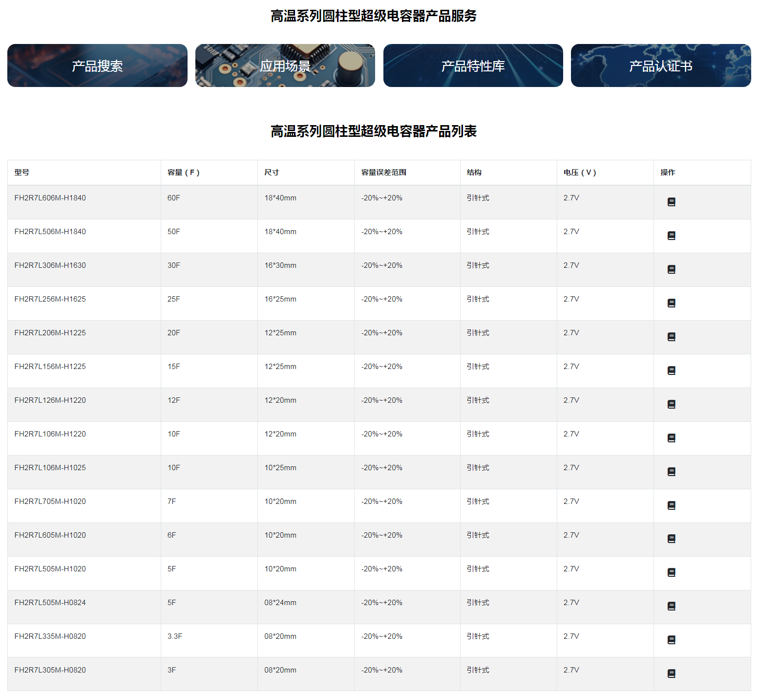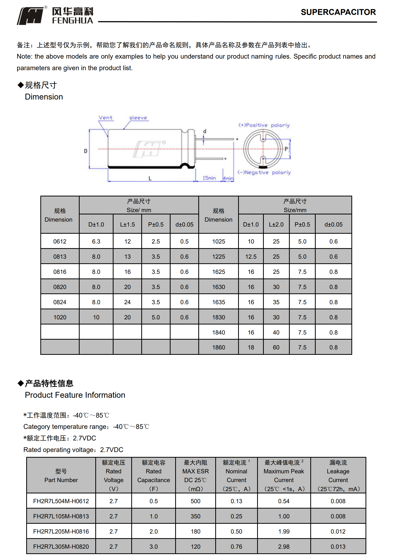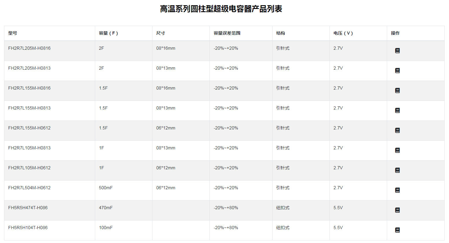 ■高溫系列圓柱型超級電容器◆特征* 內阻低,功率密度高* 自放電率小,72 小時自放電<20%*優異的循環壽命,庫侖效率達 95%以上*工作溫度范圍寬;*綠色環保,滿足 RoHs 要求◆應用* 智能儀表、行車記錄儀、照明燈具、智能家居、工業控制;* 稅控收款機、數碼相機、電動工具、電動玩具、備用電源;*無線節能鼠標、無線手寫