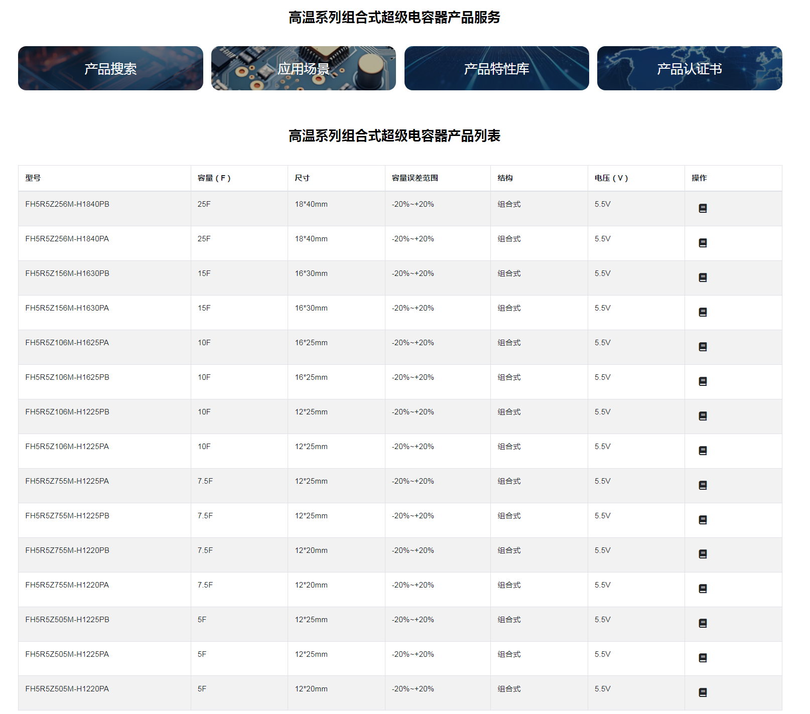 ■高溫系列組合式超級電容器◆特征* 內阻低,功率密度高* 自放電率小,72 小時自放電<20%*優異的循環壽命,庫侖效率達 95%以上*工作溫度范圍寬;*綠色環保,滿足 RoHs 要求◆應用* 智能儀表、行車記錄儀、照明燈具、智能家居、工業控制;* 稅控收款機、數碼相機、電動工具、電動玩具、備用電源;*無線節能鼠標、無線手寫