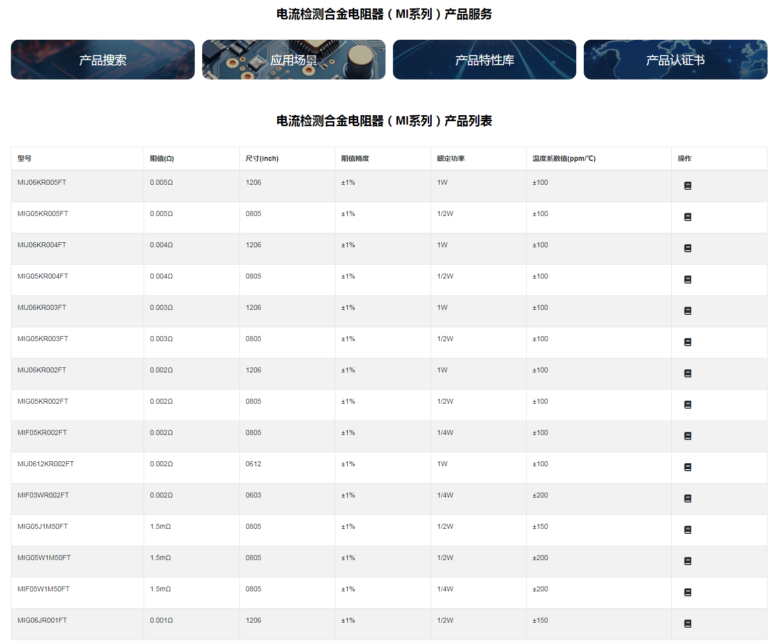 電流檢測合金電阻器(MI系列)最高功率可達1W最低TCR為 ±50PPM/℃小型化0603適于作電流探測用電阻器如電源電路等符合RoHS指令要求符合無鹵素要求應用領域:開關電源、過電流保護、電壓調節器、電源轉換器、充電器、便攜式設備等。
