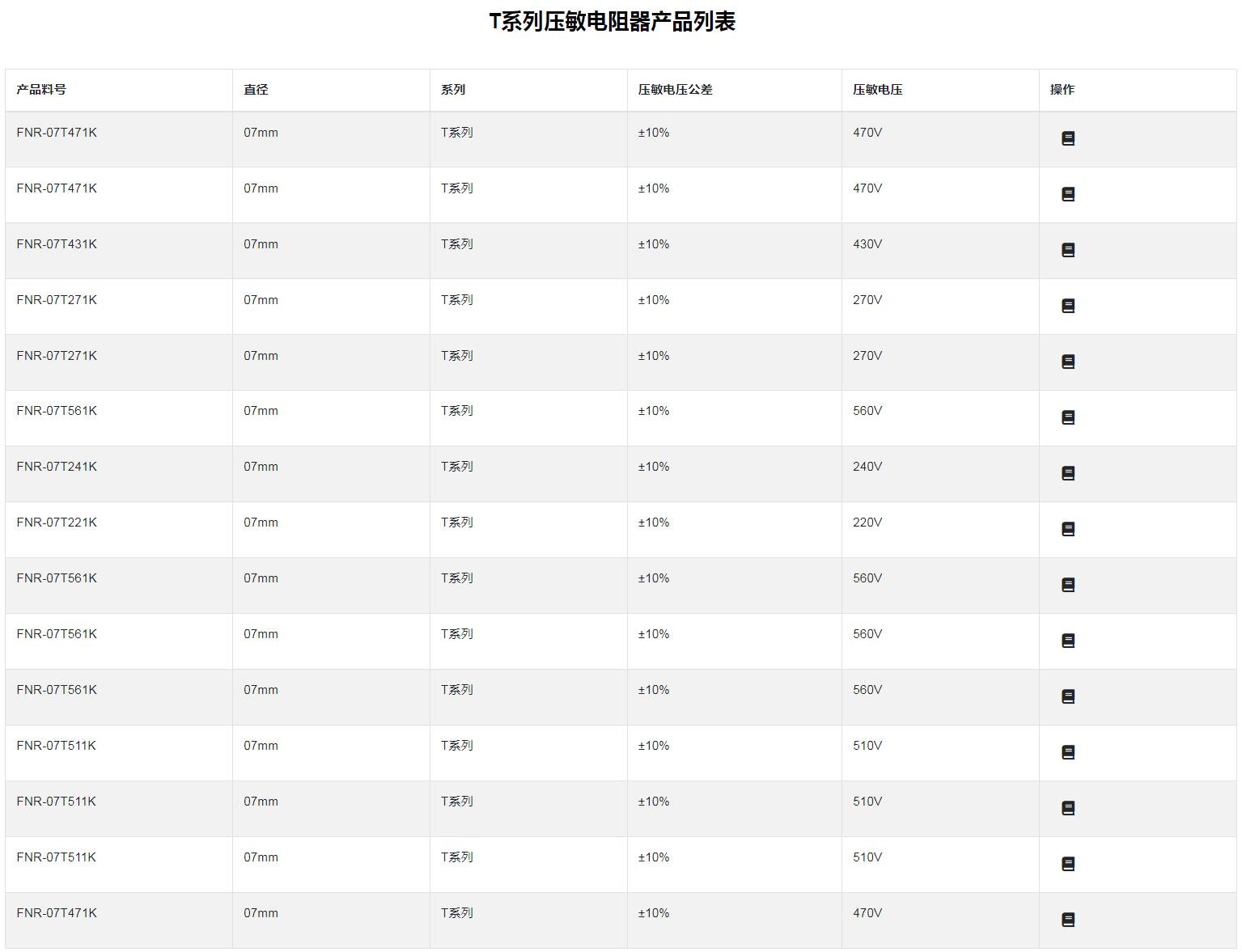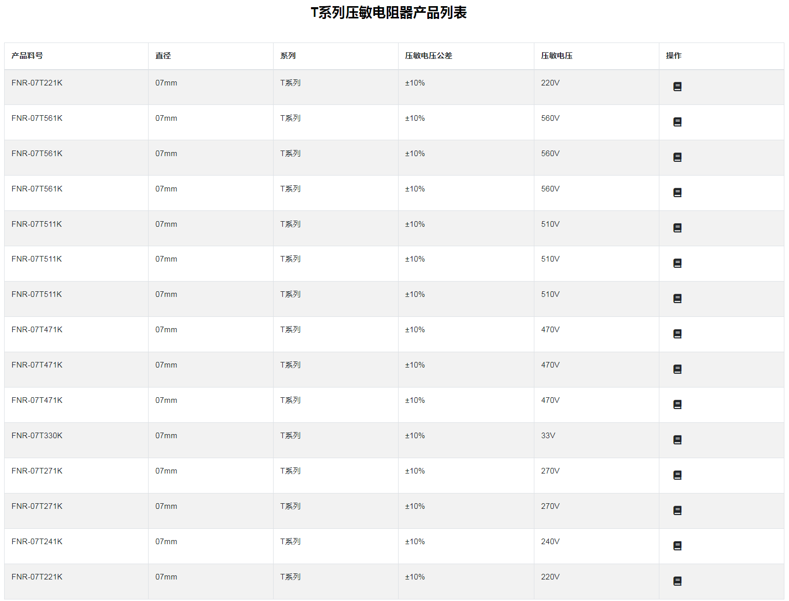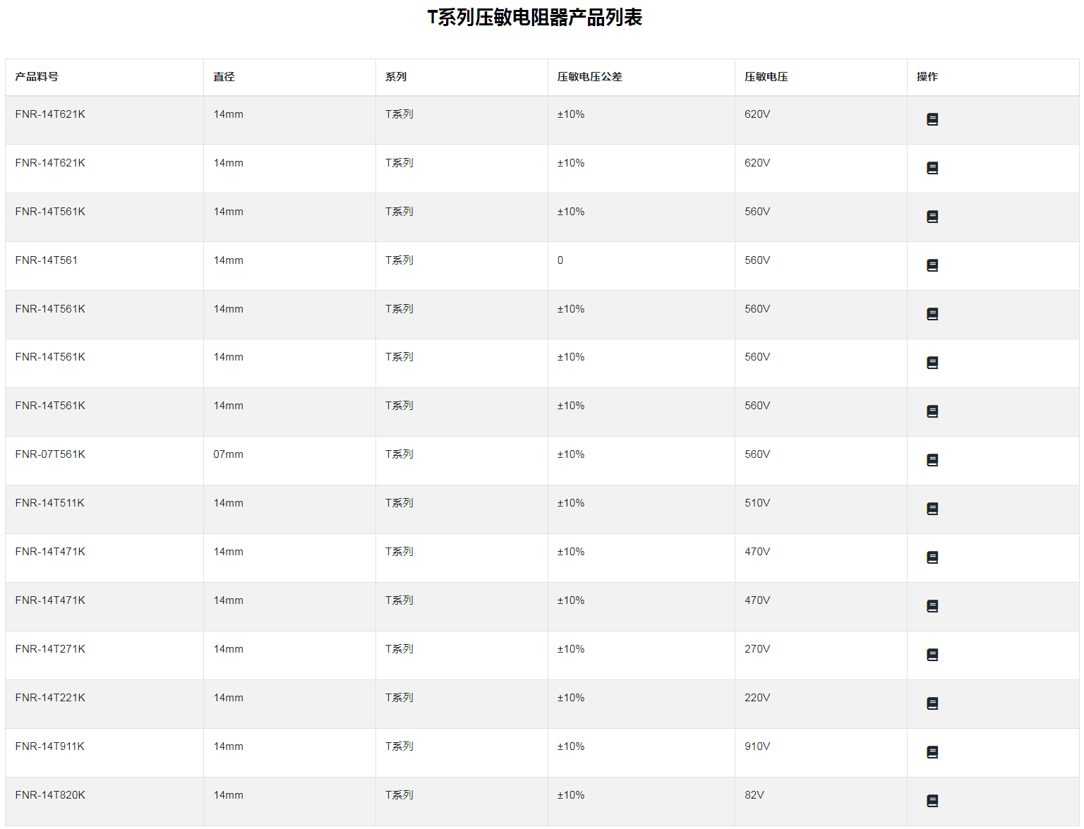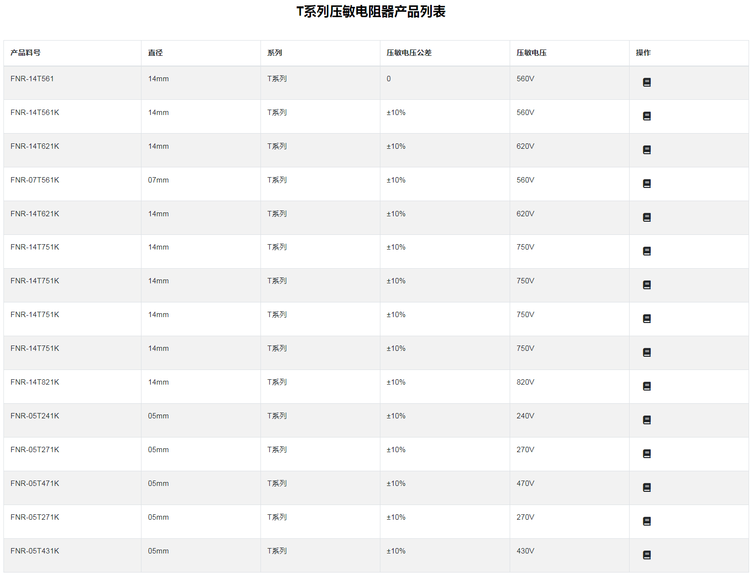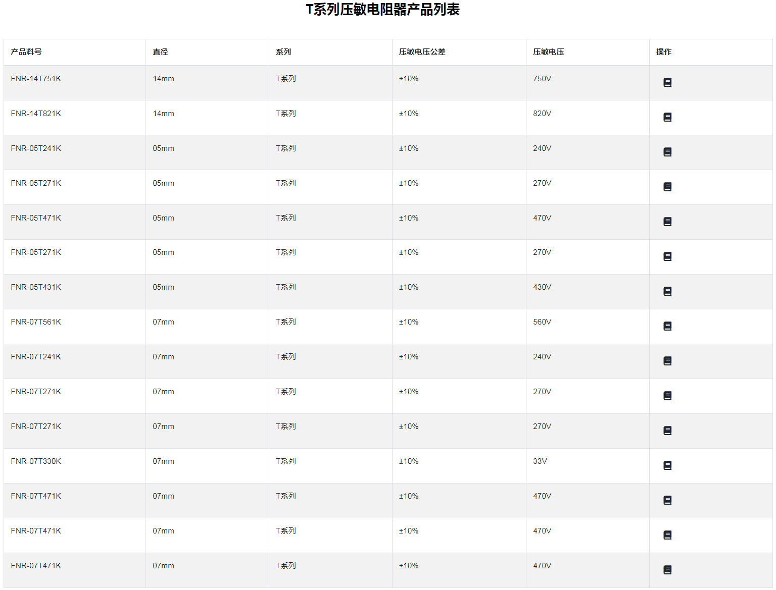 T系列壓敏電阻器特性 :強大的脈沖電流承受力:高工作溫度:超強溫沖承受力:高可靠性:壽命長:適用于新能源汽車、儲能、充電樁、充電站等各種電動設備■T 系列壓敏電阻器:氧化鋅壓敏電阻器是以氧化鋅為主要材料制造的半導體無極性電子陶瓷元件。當施加在壓敏電阻器兩端的電壓達到某一
